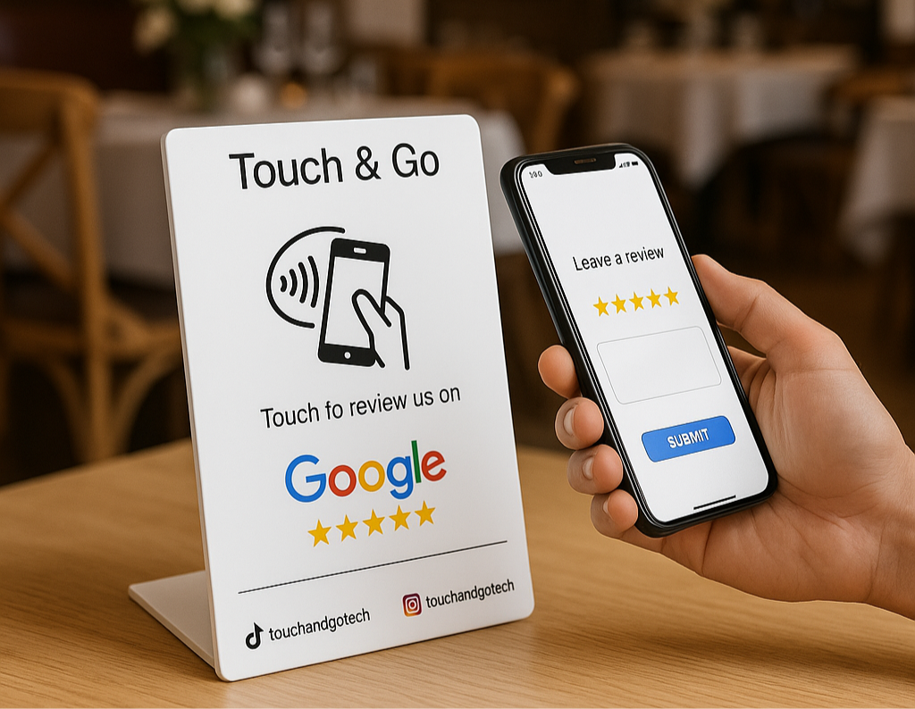 Customers simply tap their NFC-enabled smartphone against the stand, and it instantly opens your chosen website, review page, or social media profile — no app download required.